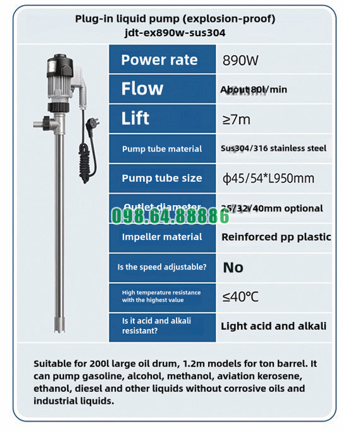 Máy bơm chất lỏng cắm trực tiếp chống cháy nổ JDT-EX890W-SUS304 hoạt động êm ái giảm tiếng ồn