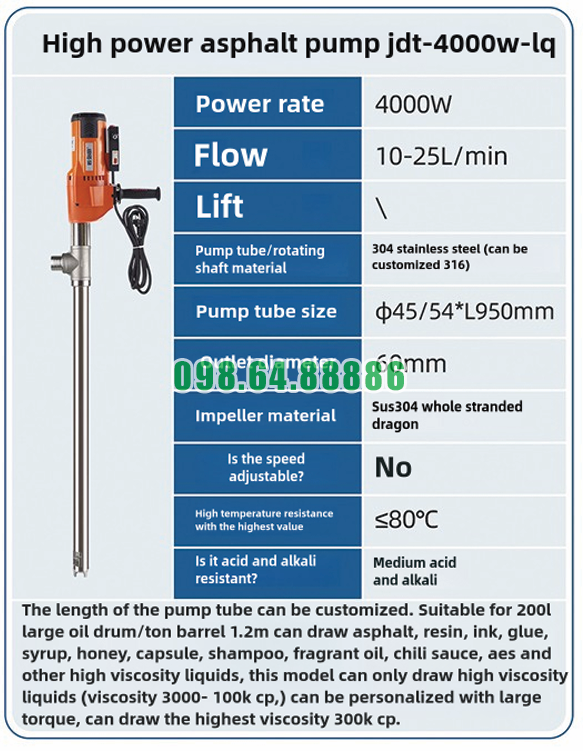 Ngoài inox 304, Bơm điện hút chất đặc từ thùng phuy JDT-4000W-LQ còn có thể tùy chỉnh sang inox 316. Đây là lựa chọn phù hợp khi môi chất có tính ăn mòn cao hơn hoặc yêu cầu khắt khe hơn về độ bền hóa học. Tuy nhiên, với đa số nhu cầu bơm chất đặc thông thường, inox 304 đã là vật liệu đáp ứng tốt cả về độ bền lẫn hiệu quả sử dụng.