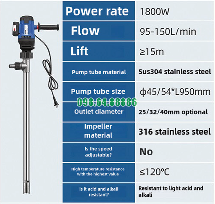 Bơm thùng phuy nhiệt độ cao JDT-1800W-G120 vận hành hiệu quả nhờ sự phối hợp trực tiếp và ổn định giữa động cơ điện công suất 1800W và cánh quạt chịu nhiệt đặt trong ống bơm.