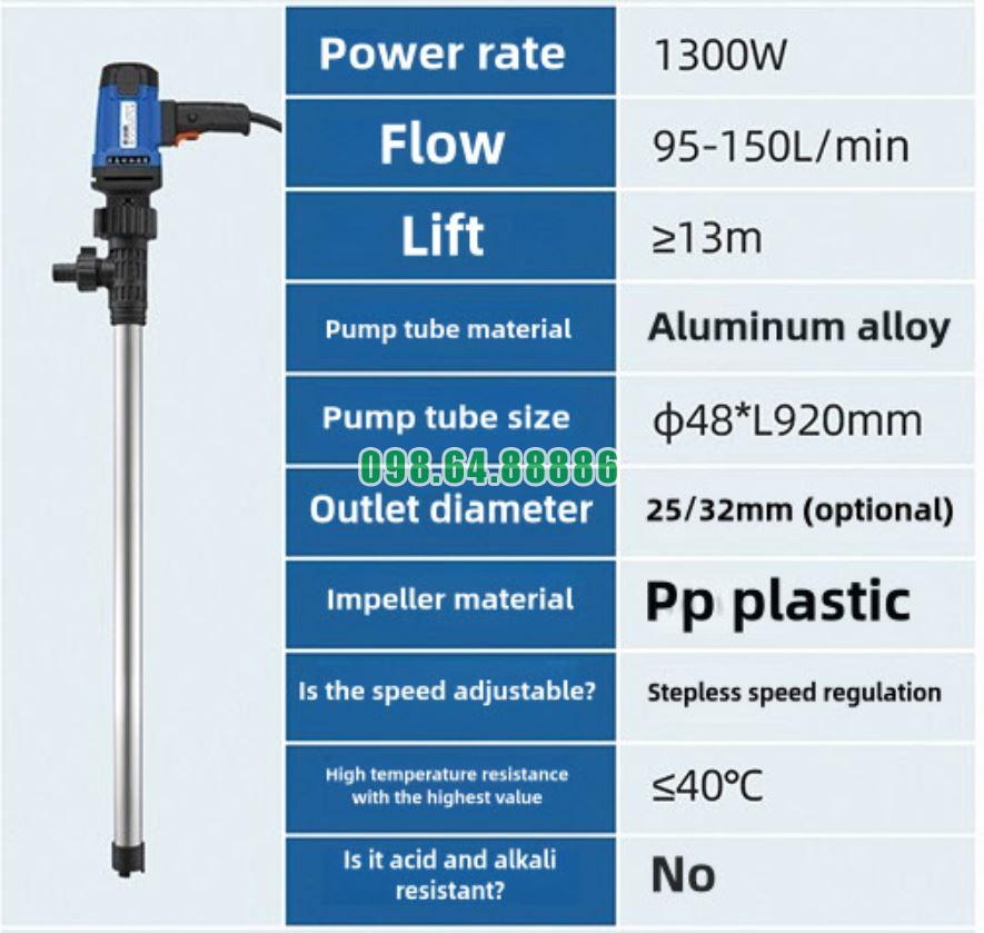 Máy bơm công suất nhỏ hơn thường chỉ phù hợp với nhu cầu bơm nhẹ, thời gian ngắn hoặc khối lượng chất lỏng ít. Trong khi đó, Máy bơm điện nhúng thùng phuy JDT-1300W-L92 với công suất 1300W: