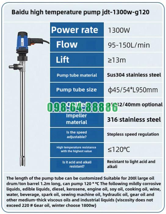 Bơm thùng phuy nhiệt độ cao JDT-1300W-G120 có cấu tạo chịu áp lực tốt