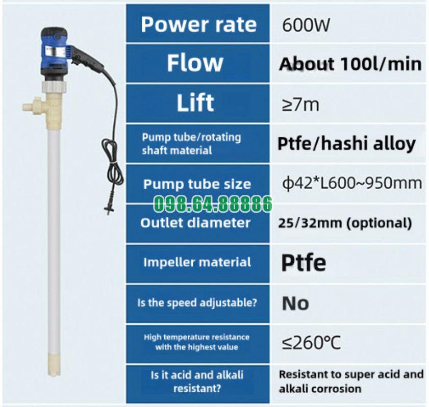 Bơm thùng phuy hóa chất nồng độ cao, ống bơm PTFE model JDT-600W-PTFE