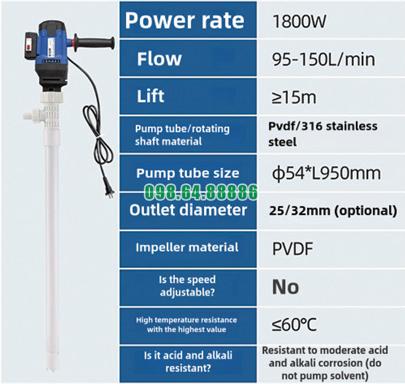 Máy bơm điện chất lỏng cắm điện JDT-1800W-PVDF hỗ trợ bơm nhiều loại dung môi khác nhau nhờ thiết kế phù hợp với các chất lỏng có độ nhớt trung bình.