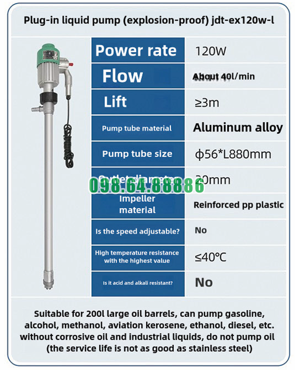 Máy bơm chất lỏng cắm trực tiếp chống cháy nổ JDT-EX120W-L được thiết kế hướng đến các môi trường làm việc đặc thù như kho nhiên liệu, xưởng sản xuất hay khu vực có nguy cơ cháy nổ cao. Dù không phải dòng vật liệu inox cao cấp, thiết bị vẫn thể hiện khả năng thích nghi tốt trong điều kiện làm việc tương đối khắc nghiệt nếu sử dụng đúng cách.